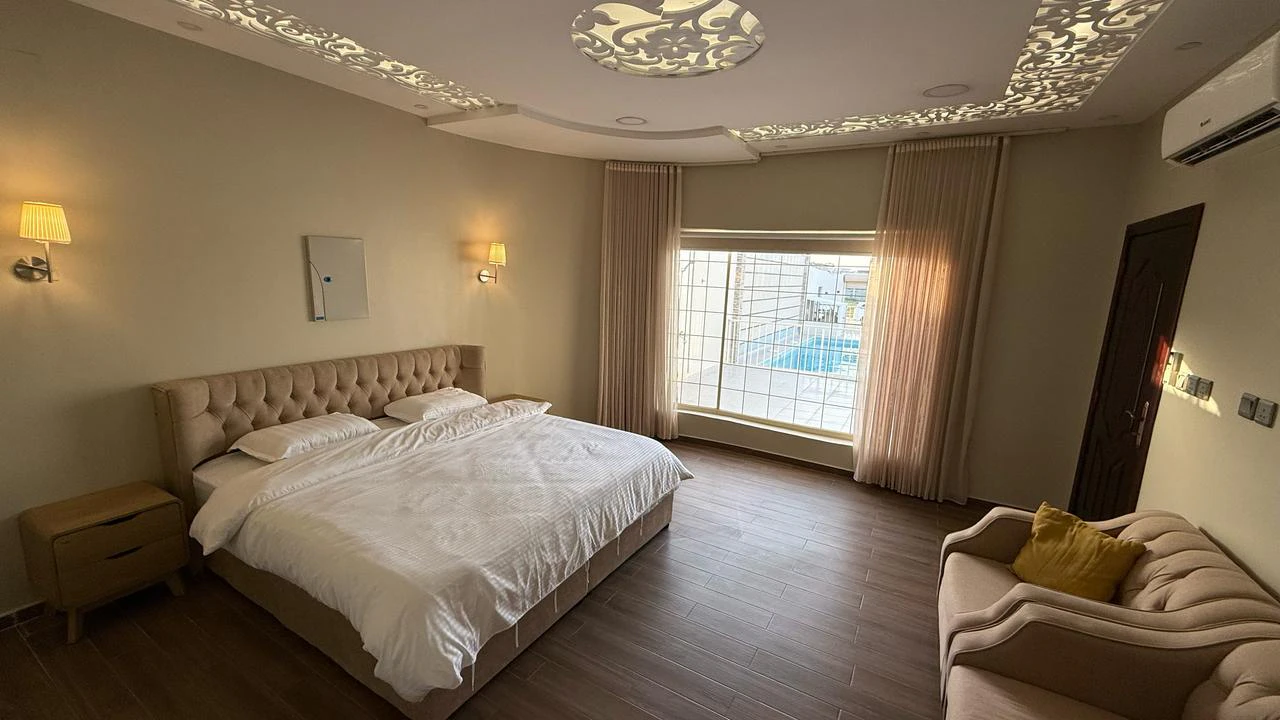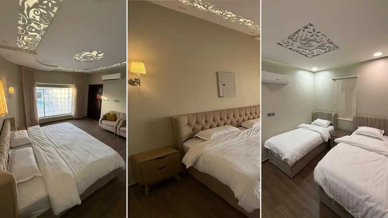 صالة جلوس بكنب تسع 10 أشخاص مع تلفزيون ذكي ودورة مياة