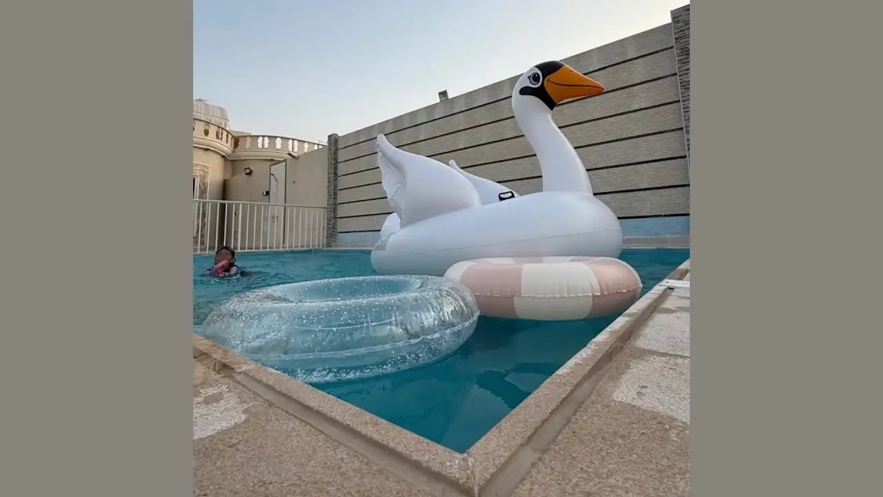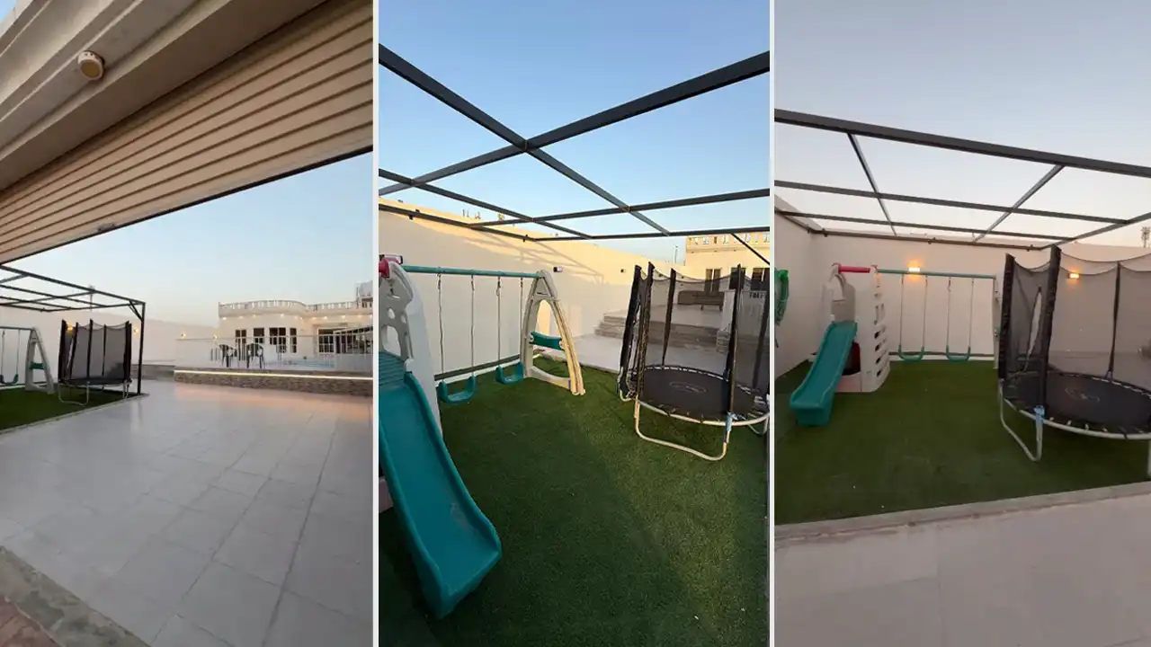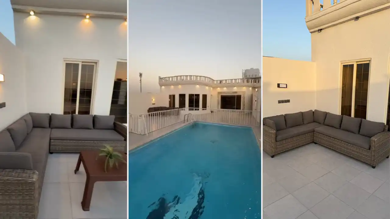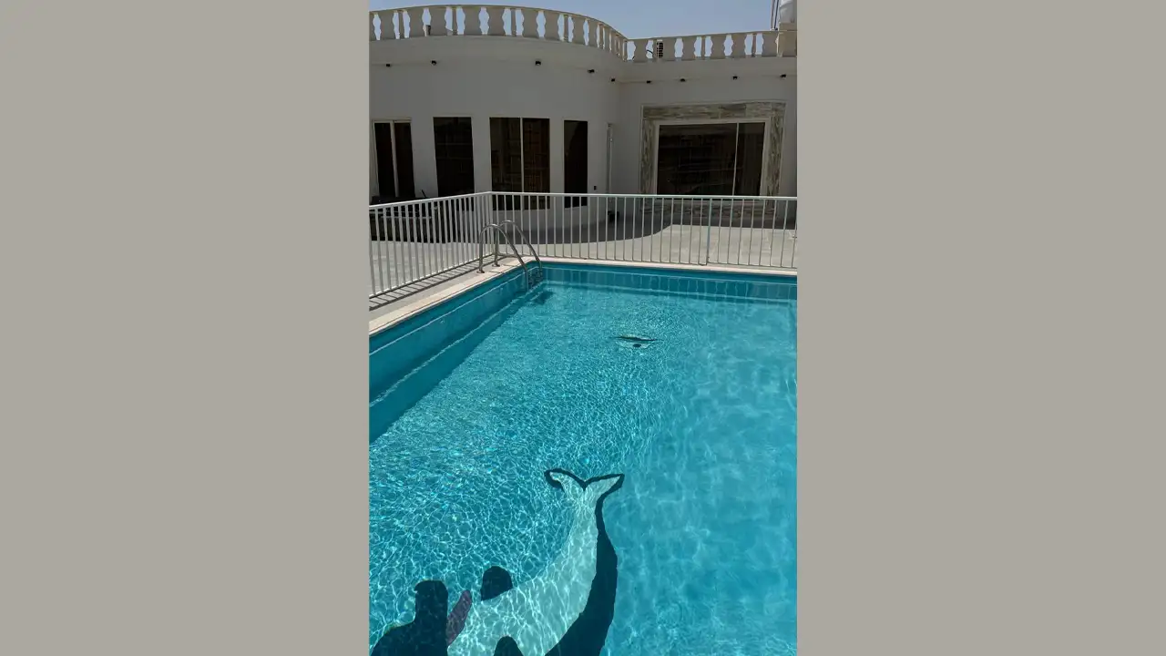 مسبح خارجي بحاجز (4×7 م) بعمق متدرّج من 110 إلى 160 سم